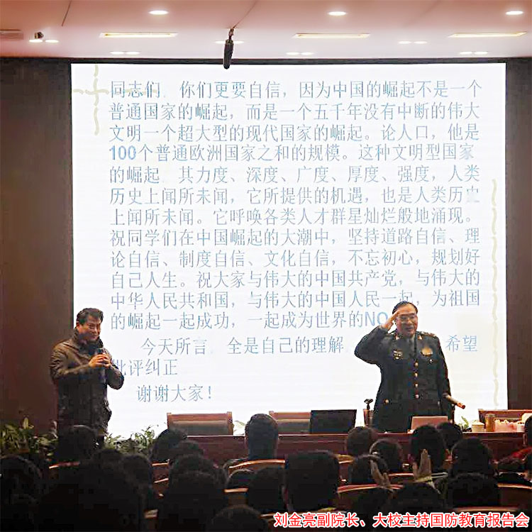 学院副院长刘金亮大校在国防教育报告总结讲话时激励学生:“你们的未来,就是祖国的未来。”“你们要敢于担当,要做一个有自信的中国人。你们要胸怀祖国,放眼世界,刻苦学习,完成学业,报效国家。”