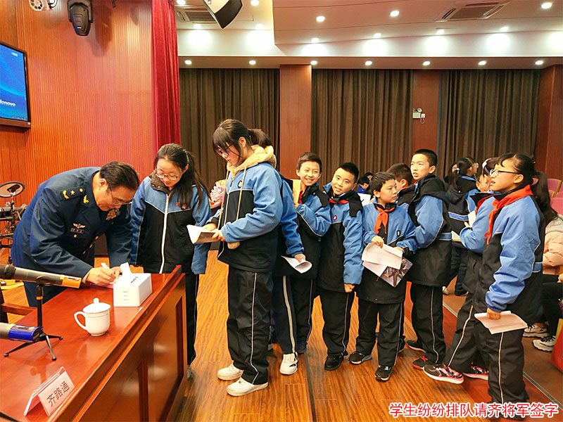齐路通将军站在新时期历史的战略高度,从大视角、大国防的角度,选用详实、丰富的资料,用通俗易懂、风味有趣的语言,给师生们上了一堂生动、精彩的国防教育课,受到了师生们的高度赞扬。课后学生们纷纷排队请齐将军签字。