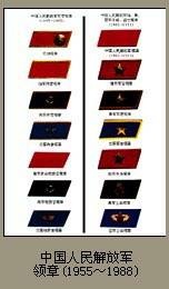 1955年实行军衔制时,陆军、海军、空军官兵的领章分别为红色、黑色和天蓝色,上缀军种、兵种或专业勤务符号,陆军、空军士兵领章还有表示军衔等级的五角星徽;海军士兵佩带小肩章,不佩带领章。1958年1月起,军官改佩军衔领章,其规格、底色与原制式相同,三面镶金黄色边,并有区分军衔等级的星徽和横线,尉级军官为一道黄色横线,校级军官为两道黄色横线,将军和元帅领章无横线。其中少尉、少校、少将为一颗星徽,中尉、中校、中将为二颗星徽,上尉、上校、上将为三颗星徽,大尉、大校、大将为四颗星徽,元帅领章缀一枚国徽和一颗星徽。海军陆上士兵、海军航空兵士兵冬常服肩章和海军士兵大衣肩章,改为领章。