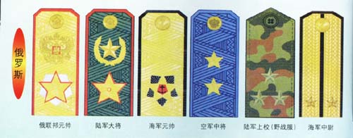 俄联邦元帅;将官:大将、上将、中将、少将;校官:上校、中校、少校;尉官:大尉、上尉、中尉;准尉:高级准尉、准尉;军士:大士、上士、中士、下士;兵:上等兵、列兵。