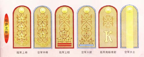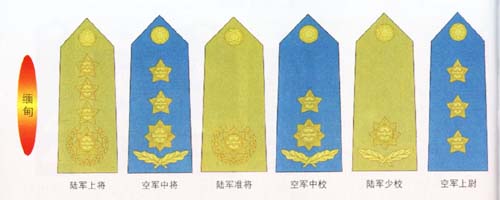 将官:大将、上将、中将、少将;校官:大校、上校、中校、少校;尉官:大尉、上尉、中尉、少尉;军士:大士、上士、中士、下士;兵:上等兵、列兵。