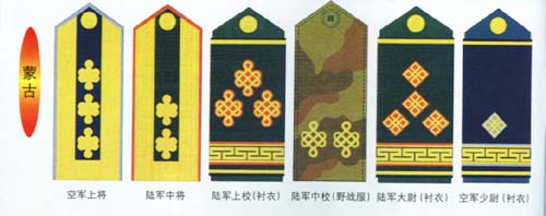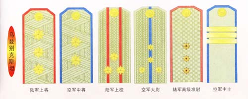 高级军官:大元帅、元帅、次帅、大将、上将、中将、少将;校官:大校、上校、中校、少校;尉官:大尉、上尉、中尉、少尉;士官:特务上士、上士、中士、下士;兵:上等兵、下等兵。