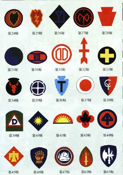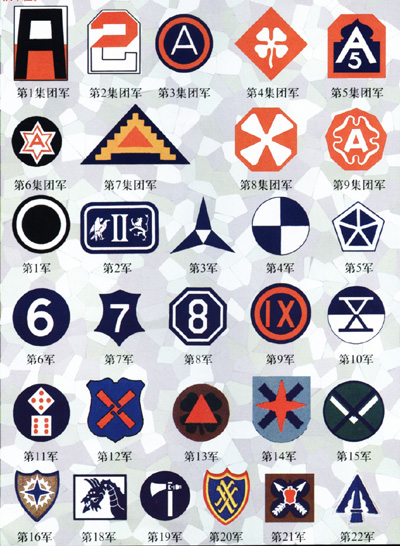 美国陆军的集团军、军、师的官兵均佩带臂章。美国陆军集团军的番号为1-9,共9个集团军。军的番号为1-22,其中无17,共21个军。师的番号为:1-11师,13师,17-18师,23-41师,43-47师,63师,65-66师,69-71师,75-104师,第1-3骑兵师,第61-66骑兵师,第1-3装甲师,共计87个师及1个装甲兵司令部。各部队的臂章分制服和作训服两种,以便于识别所属部队单位。