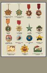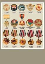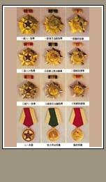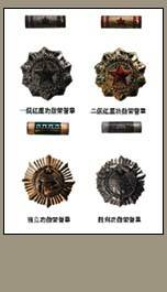 中华人民共和国勋章奖章 中华人民共和国授予中国人民解放军在中国人民革命战争时期有功人员的荣誉证章。包括:八一勋章和八一奖章;独立自由勋章和独立自由奖章;解放勋章和解放奖章。 八一勋章和八一奖章的中心图案是红星和八一,突出反映中国共产党于1927年8月1日独立领导革命武装的光辉史实;独立自由勋章和独立自由奖章的中心图案是红星和延安宝塔山,象征在中国共产党的领导下,革命圣地延安是中国人民抗日民族战争的革命大本营;解放勋章和解放奖章的中心图案是红星和天安门,象征中国共产党领导人民武装夺取全国胜利。