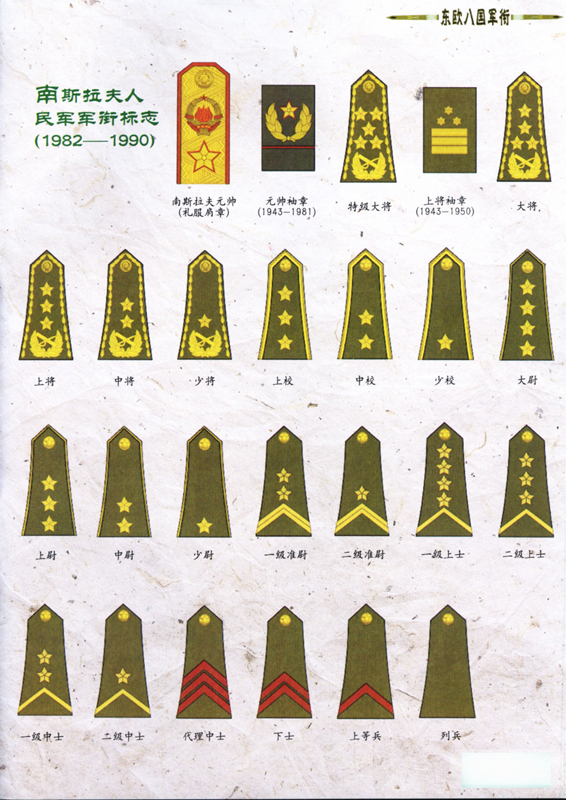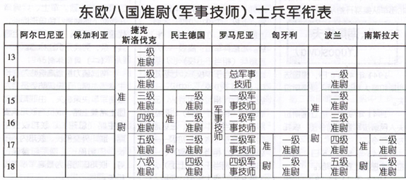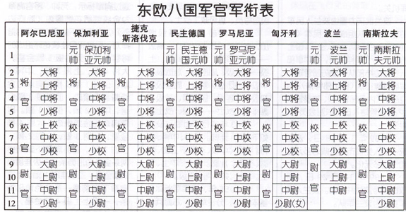 纵观东欧八国近50年的"社会主义军衔制",其特点一:军官军衔基本一致,都使用了苏式军衔,只是阿尔巴尼亚、捷克斯洛伐克、匈牙利三国不设元帅,罗马利亚(男军官)、波兰两国不设少尉军衔,其他与苏联军官军衔基本一致。其特点二:准尉(军事技师)、士兵军衔各不相同,不仅与苏联士兵军衔不一样,各国之间不同,有的国家连等级区分也与众不同,有的设高级士官、初级士官,有的设准军官,有的设初级指挥员……至于军衔标志,则如万花筒般令人目不暇接。为便于读者对这八国的军衔等级作个横向比较,笔者制作了《东欧八国军官军衔表》和《东欧八国准尉(军事技师)、士兵军衔表》(均为最终的变化结果),供参阅。