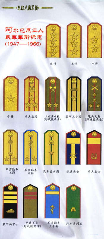 阿民族解放军从1944年5月28日起实行军衔制,到1966年3月7日又学习中国的经验取消了军衔制,直到1991年成立阿尔巴尼亚共和国才又实行军衔制,其间25年武装部队无军衔,也是欧洲军队史上的唯一。
