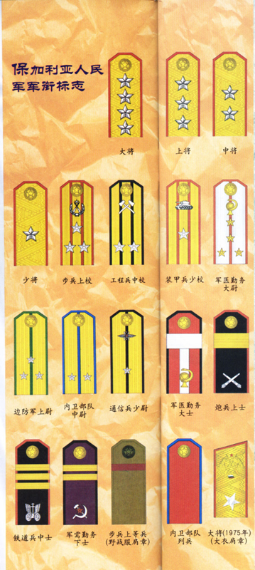 由于保加利亚是传统的斯拉夫国家,其人民、语言、传统与原苏联有千丝万缕的联系。其军队军衔也不例外,与苏军如出一辙,苏联1974年将大将军衔标志由4颗将星改为1颗帅星后,保加利亚随即将大将军衔标志也改为军徽加大银星。保军军衔区分为:元帅--保加利亚元帅。将官--大将、上将、中将、少将。校官--上校、中校、少校。尉官--大尉、上尉、中尉、少尉。军士--大士、上士、中士、下士。兵(水兵)--上等兵(上等水兵)、列兵(水兵),共6等18级。与苏联军衔的不同点是:苏联1971年、1981年设立了准尉、高级准尉,保军未设。保军军衔标志与苏军相近,都是以肩章作为军衔主要表达方式,军官以金黄色(军兵种)、银白色(专业勤务)版面为主,士兵以草绿色(陆军)、深绿色(边防军)、天蓝色(空军)、黑色(海军)版面为主,军官以上述颜色为边线、纵线区分军兵种。