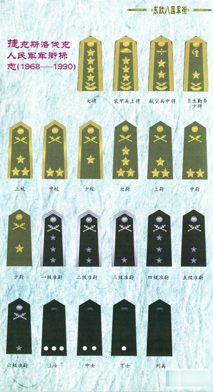 捷人民军的军衔起源于1941年在苏联建立的"捷克斯洛伐克第一独立营",当时设置的军衔有:上校、中校、少校、大尉、上尉、中尉、少尉、军士长、上士、中士、下士、上等兵、列兵等。以后,随着捷军的扩大,军衔等级的设置也日益完善。1965年,捷克斯洛伐克人民军的军衔体系最终确定:将官--大将、上将、中将、少将。校官--上校、中校、少校。尉官--大尉、上尉、中尉、少尉。准尉--一级准尉、二级准尉、三级准尉、四级准尉、五级准尉、六级准尉。军士--上士、中士、下士。战士--列兵,共7等21级。捷军军衔不仅与其他东欧国家的军衔不同,而且与世界各国军衔也大相径庭。主要区别:1、设立准尉多达六级,创当时(20世纪60至90年代)的世界之最。捷军准尉主要由服志愿兵役的技术、专业士兵充任,另征集部分地方技术职工。所担任的职务主要是部队的基层技术岗位,如驾驶员、雷达手、司务长等。捷军准尉的待遇、军衔薪金与中校至少尉军官相近。2、兵(捷军称战士)只设列兵一级,为各国"兵衔"最少。捷军军衔标志由肩章、领章、帽饰等组成,本文主要介绍肩章。将官肩章镶花饰金边,大将缀四颗军官星徽(金黄色五角星,将校尉相同),上将三星,中校二星,少将一星。校官肩章镶素金边,上校三星,中校二星,少校一星。尉官肩章无金边,大尉四星,上尉三星,中尉二星,少尉一星。军官肩章钉缀金黄色军徽图案肩章扣。一至三级准尉肩章镶素银边,一级准尉缀三颗准尉星徽(银白色小五角星),二级准尉二星,三级准尉一星。四至六级准尉肩章无银边,四级准尉三星,五级准尉二星,六级准尉一星。准尉肩章钉缀银白色军徽图案肩章扣。