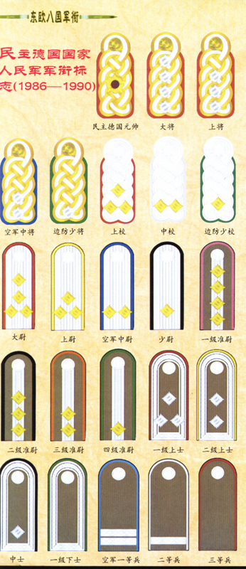 1956年3月,民主德国国家人民军建立后,开始实行"东德特色"的军衔制度:将官--上将、中将、少将。校官--上校、中校、少校。尉官--大尉、上尉、中尉、少尉。士官--上士、中士、一级下士、二级下士。列兵--一等兵、二等兵、三等兵。水兵--一等水兵、二等水兵、三等水兵。
