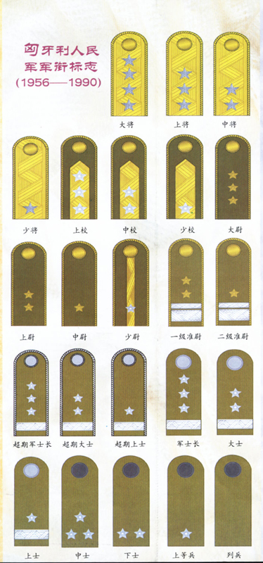 匈牙利人民军的主要军衔标志是肩章,其常服(礼服)肩章样式如下: