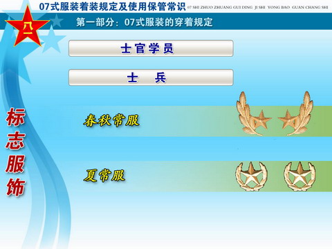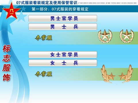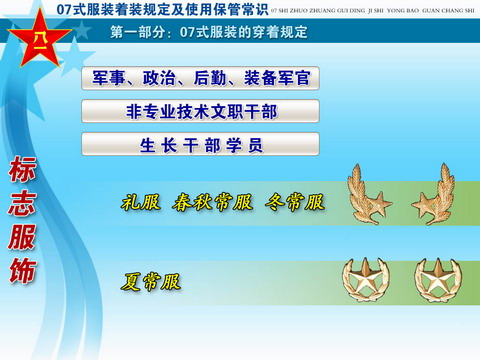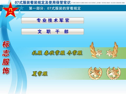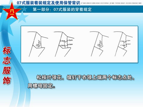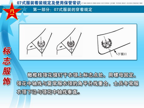军人佩带在衣领上的识别标志 。多为金属制品。中国人民解放军年实行新的军衔制时,全体官兵由佩带领章改为佩带领花。军人常服和制式衬衣的领花为军种或专业技术符号,军官礼服的领花不分军种,只分军衔等次,将官礼服领花由五星和松枝叶组成,采用金绢等材料手工刺绣在礼服面料的底布上,呈五边形,工厂直接缀钉在衣领的规定位置。校官礼服领花由金属仿刺绣的五星和麦穗组成,用其背面的螺丝、螺帽缀钉在衣领规定的位置。尉官礼服领花是由金属仿刺绣五星和宝剑形光芒线组成的,用螺丝、螺帽钉缀在衣领的规定位置。将官领花上绣的松枝叶,表示健康长寿之意。校官领花上的仿刺绣麦穗,表示人民军队中级军官做出不可磨灭的贡献。尉官领花底衬宝剑形光芒线,表示朝气蓬勃。月,文职干部统一配发军装,其领花由金色的齿轮、麦穗和红五角星组成。中国人民武装警察部队官兵的领花分为武警领花和武警技术警官领花。武警领花以红色盾牌为主体,内有一颗金色五角星和两枚交叉的金色步枪,用两枝金色的松校托起盾牌 ;武警技术警官领花 ,主体图案与武警领花相同,只是在红色盾牌内镶有白色卫星轨迹和金色的地球。世界各国军队都有自己特色的领花。日本陆军为激发军人的敬业精神和职业荣誉感,从日起带设计有各自专业或职业标记的兵种领花,分步兵、装甲兵、炮兵、航空兵、工程兵、通信兵、兵器兵、军需兵、运输兵、化学兵、司法兵、财会兵、卫生兵和文艺兵种。佩带范围上至陆军上校,下至陆军中士。各兵种的领花设计采用了象征手法,使各种领花图案带有明显的专业特征和寓意。