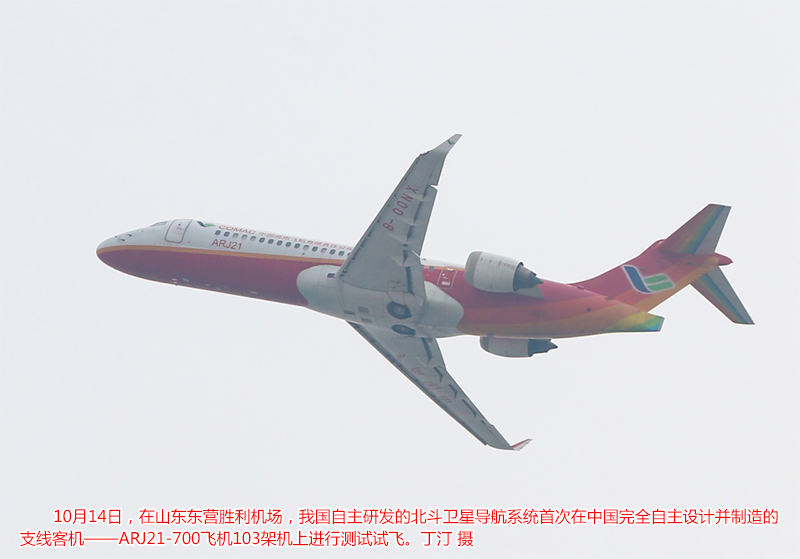 新华社上海10月14日电(贾远琨) 在山东东营胜利机场,我国自主研发的北斗卫星导航系统首次在中国完全自主设计并制造的支线客机——ARJ21-700飞机103架机上进行了测试试飞,试验取得圆满成功。