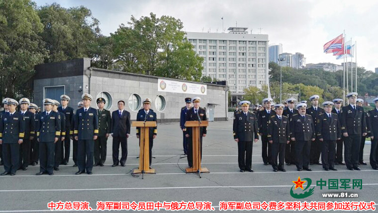 上午9时许,中方总导演、海军副司令员田中和执行导演、海军副参谋长胡中明与俄方总导演、海军副总司令费多坚科夫和执行导演、滨海边疆区舰队副司令米哈伊诺夫共同参加送行仪式。根据联合演习计划方案,此次“海上联合-2017”第二阶段演习在日本海、鄂霍茨克海南部海域举行,以“联合救援和保交行动”为课题,是在今年7月份中俄“海上联合-2017”第一阶段基础上的深化和拓展。演习中,双方将组织救助遇险坐底潜艇、防空演练、反潜防御、反舰防御、联合解救被挟持船舶、救助遇险舰船等演练。