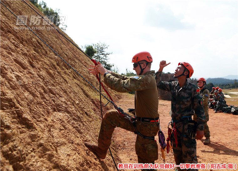 在山地丛林穿越课目训练中,双方队员单兵负重20多公斤,在不提供任何现代导航装备的条件下,共同判定方位、选择路线、开辟通路,在海拔2000多米、荆棘遍布的丛林山地中穿越30公里。面对一处高近80米、坡度近90度的陡崖,中澳官兵采取协作攀登、滑降和架设绳桥、牵引横越等方式,有效克服沟壑地形阻隔。泅渡训练时,双方因地制宜、就地取材,共同制作军裤气囊、竹筏、浮包等简易漂浮器材,在水深15米的水域协作完成300米泅渡。
