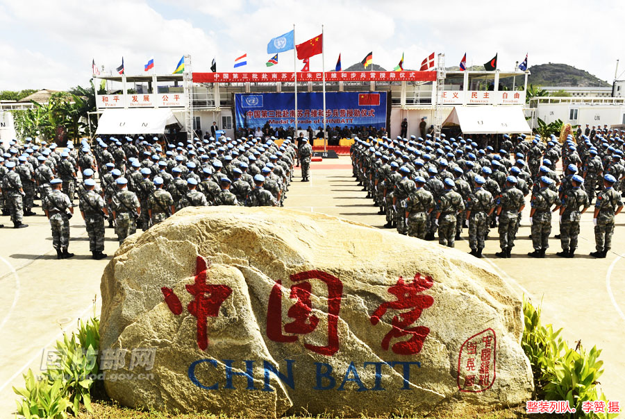 当地时间10月2日,联合国驻南苏丹特派团(联南苏团)授予中国第三批赴南苏丹(朱巴)维和步兵营全体官兵“和平荣誉勋章”,以表彰他们过去一年在维护南苏丹和平事业中所作贡献。