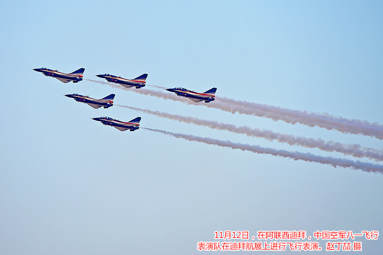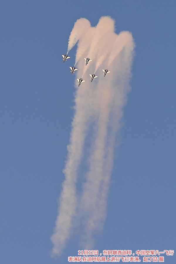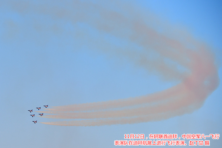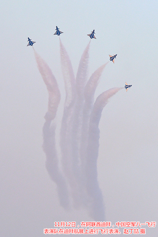 北京时间12日18时,阿联酋骑士飞行表演队在轰鸣声中飞上蓝天,拉开了迪拜航展飞行表演帷幕。飞行表演共持续约3个小时,F—22、苏—35、A350等10多型军、民用飞机先后进行了单机表演,俄罗斯勇士飞行表演队和八一飞行表演队也同场炫技。