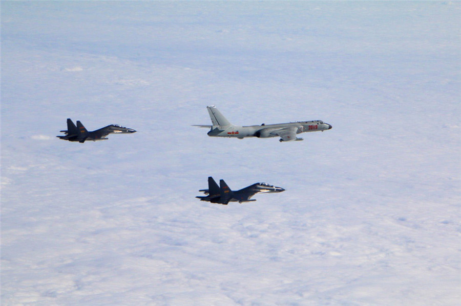 当日,中国空军多型战机进行成体系远洋训练,轰—6K等多型战机编队飞越宫古海峡,提升了海上方向实战能力。李春光 摄
