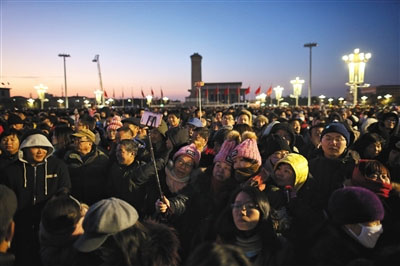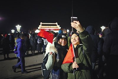 1月1日晨,天安门广场,群众举手机观看新年第一次升旗仪式。 |