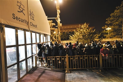 1月1日凌晨4时30分,天安门广场,市民排队进入安检处。 |