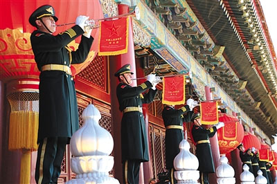 礼号手在北京天安门城楼吹响升旗号角。新华社记者 李刚 摄 |