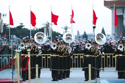 7时30分许,解放军军乐团在旗杆南侧就位。随后,30名礼兵持枪在金水桥南侧列队,天安门城楼上,8名礼号手吹响号角。