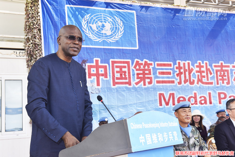 授勋仪式上,联南苏团副特别代表舒马赫高度赞赏中国对联合国维和事业的支持,充分肯定中国维和官兵的奉献和专业精神。他表示,中国维和步兵营执行的武装护卫、长途巡逻工作为南苏丹人民带来了和平。舒马赫还特别对中国维和部队中的女性官兵在南苏丹和平事业中作出的贡献表示感谢。