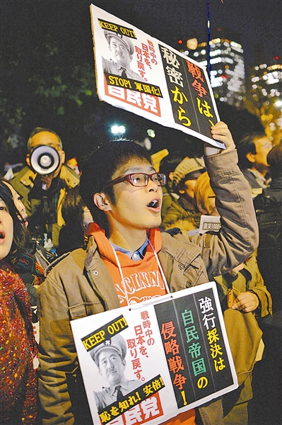 日本执政党不顾在野党和民众的强烈反对,6日晚在国会参议院全体会议上强行表决通过了旨在严惩泄露国家机密行为的《特定秘密保护法案》。该法案已于11月26日在众议院获得通过,因此在参议院表决通过后已生效,但将在一年后正式付诸实施。然而,这一动作不仅遭到民主党等在野党的强烈反对,同时也受到了日本民众的强烈抗议。