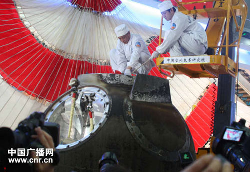 工作人员进入返回舱,取出舱内物品(中广网记者刘梦摄)