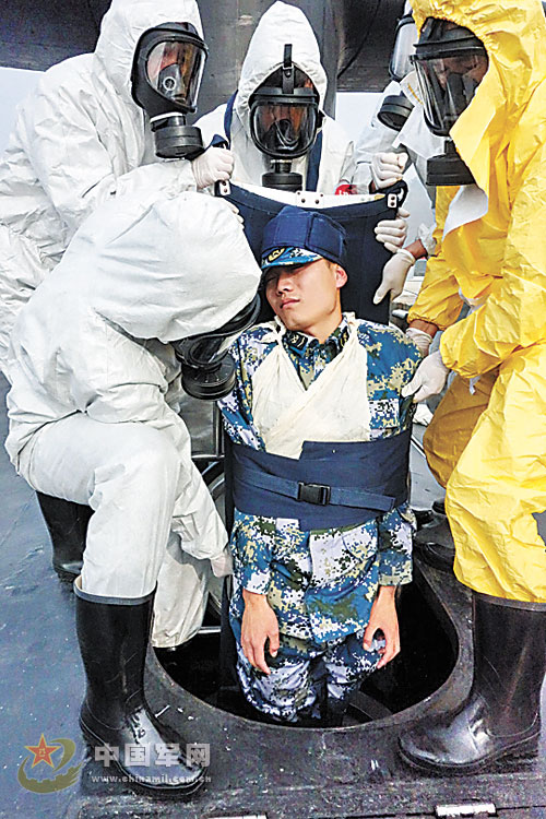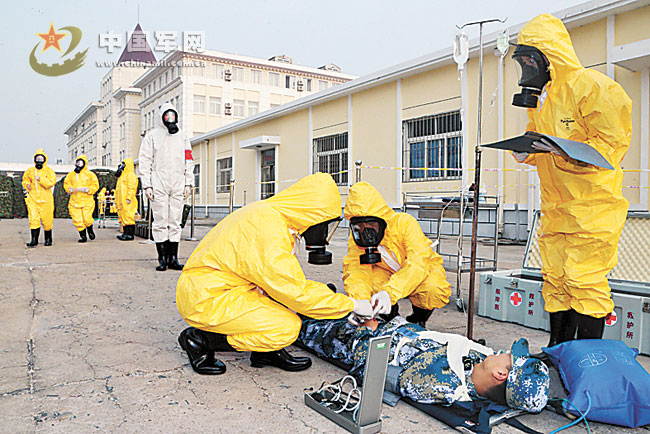 10月22日,在北海舰队某训练基地,一场核化条件下的战场救护演练正在进行。上午11时,训练在?“军港码头遭敌核化武器攻击”的背景下展开。随着一阵刺耳的警报,军港码头硝烟四起,基本指挥所迅速启动应急预案,7支应急分队立即出动:陆上运输分队组织人员迅速辙离;医疗救护分队对受伤官兵进行救治;陆上、海上洗消分队开辟洗消通道,对营区和艇船进行全方位洗消……演练过程中,各分队行动迅速,以实战标准完成上级下达的各项救治洗消任务,训练一直持续到下午16时结束。监测分队报告:营区核沾染剂量水平恢复正常,伤员得到有效救治。