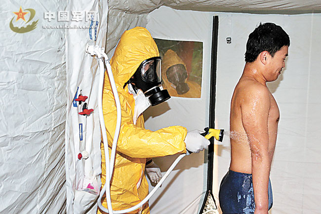 受沾染伤员被送入帐篷洗消。