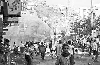 5月10日,也门警方用高压水龙驱散示威群众。大多数国家的当局都“有限度地使用暴力”。